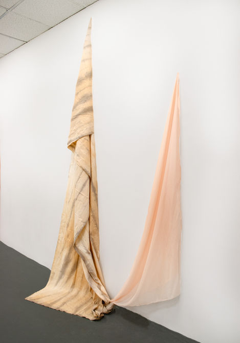 Iron oxide, a pigment derived directly from the earth, stains the fabric shades of pink—at once corporeal and emotional. Layered alongside synthetic inks and dyes, this work positions geological time beside manufactured color, while the introduction of black evokes the pre-formal dark from which color emerges. The fabric is creased and folded, with pigment settling into the folds to preserve the memory of each movement. The work becomes a record of change, its initial gestures transposed into the fabric’s hang and drape.